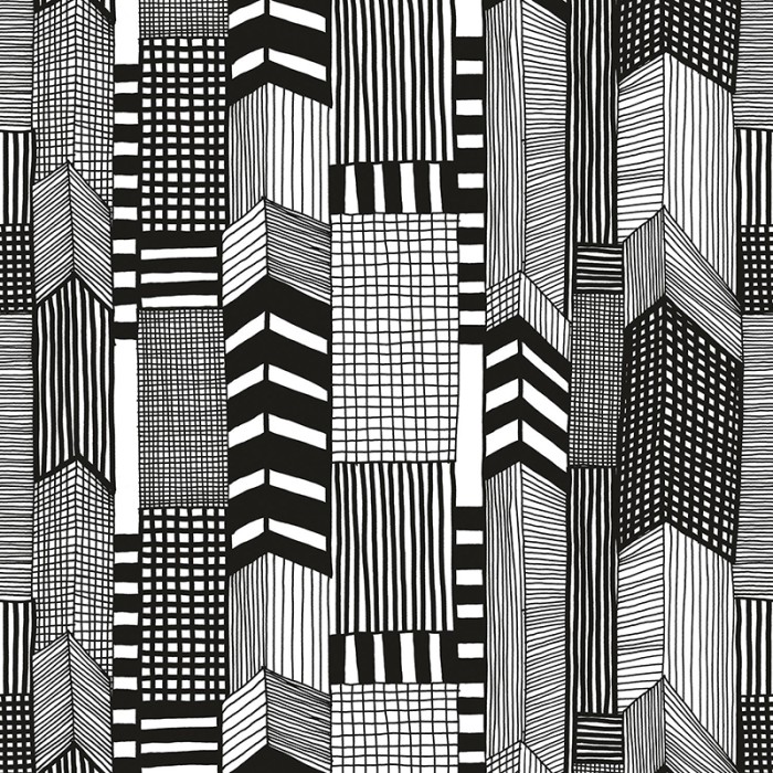 Marimekko Ruutukaava design, abstract drawing of skyscraper buildings in black and white.